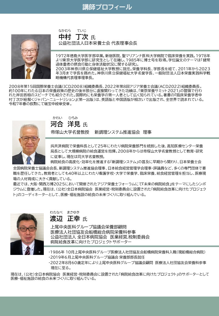 そして第二部では、講師の中村様に加え、病院給食に様々なお立場で50年向き合ってこられた新調理システム推進協会理事の帝塚山大学名誉教授 河合洋見様と、さらに病院給食の黒字経営を実現されている船橋総合病院 前栄養部長・同グループ栄養部顧問 渡辺正幸様をお迎えしパネルディスカッションを行います。昭和・平成・令和と続く病態別栄養管理のもと中央調理・中央配膳ベースの時代から、欧米で主流となる栄養成分別管理と HACCP前提で開発されたニュークックチルシステムへの日本版パラダイムシフトを、病院給食業界全体でいかに進めるべきかについて議論いたします。